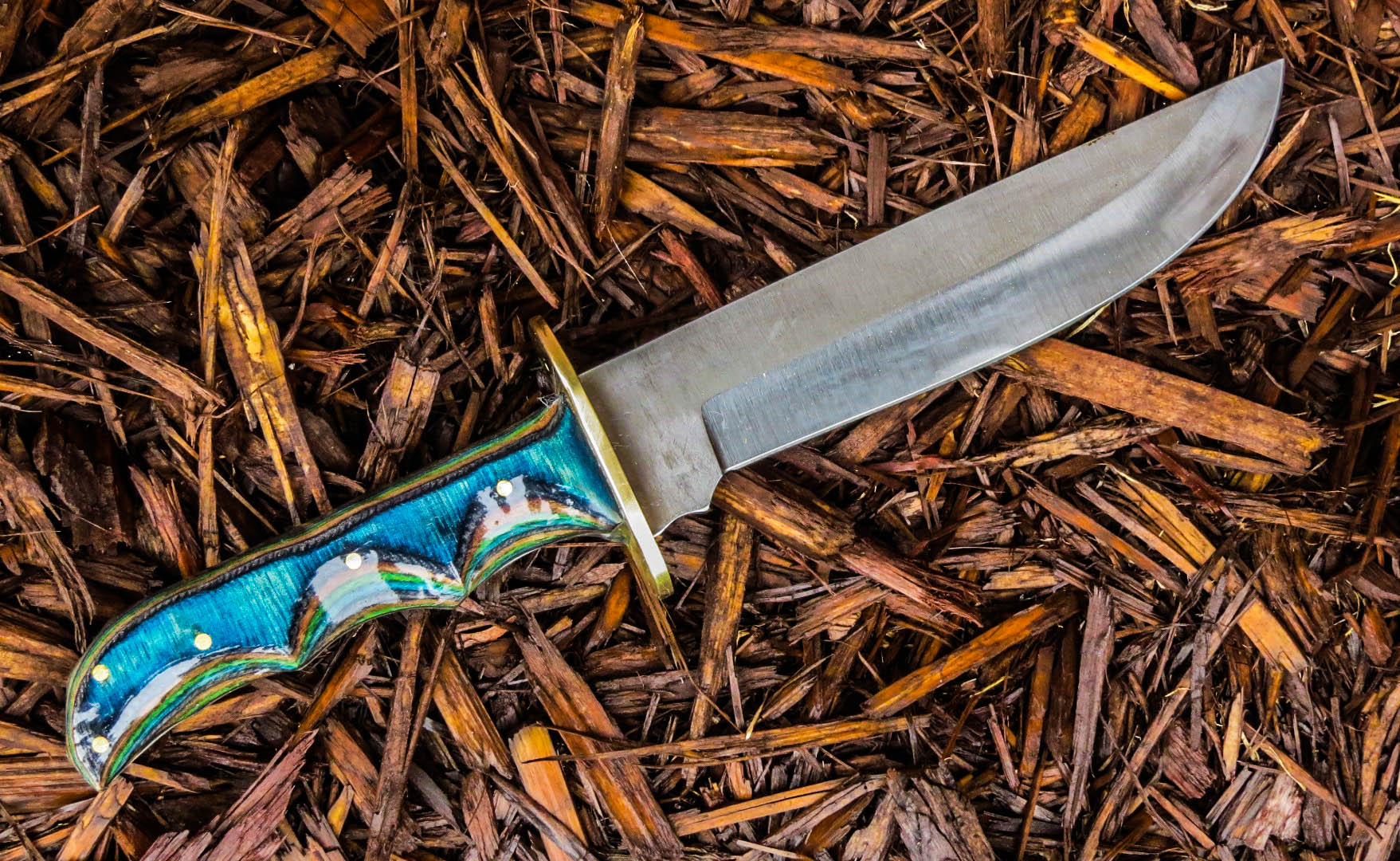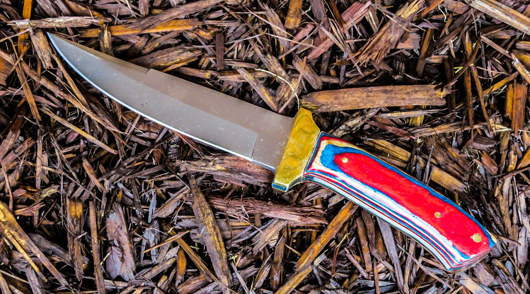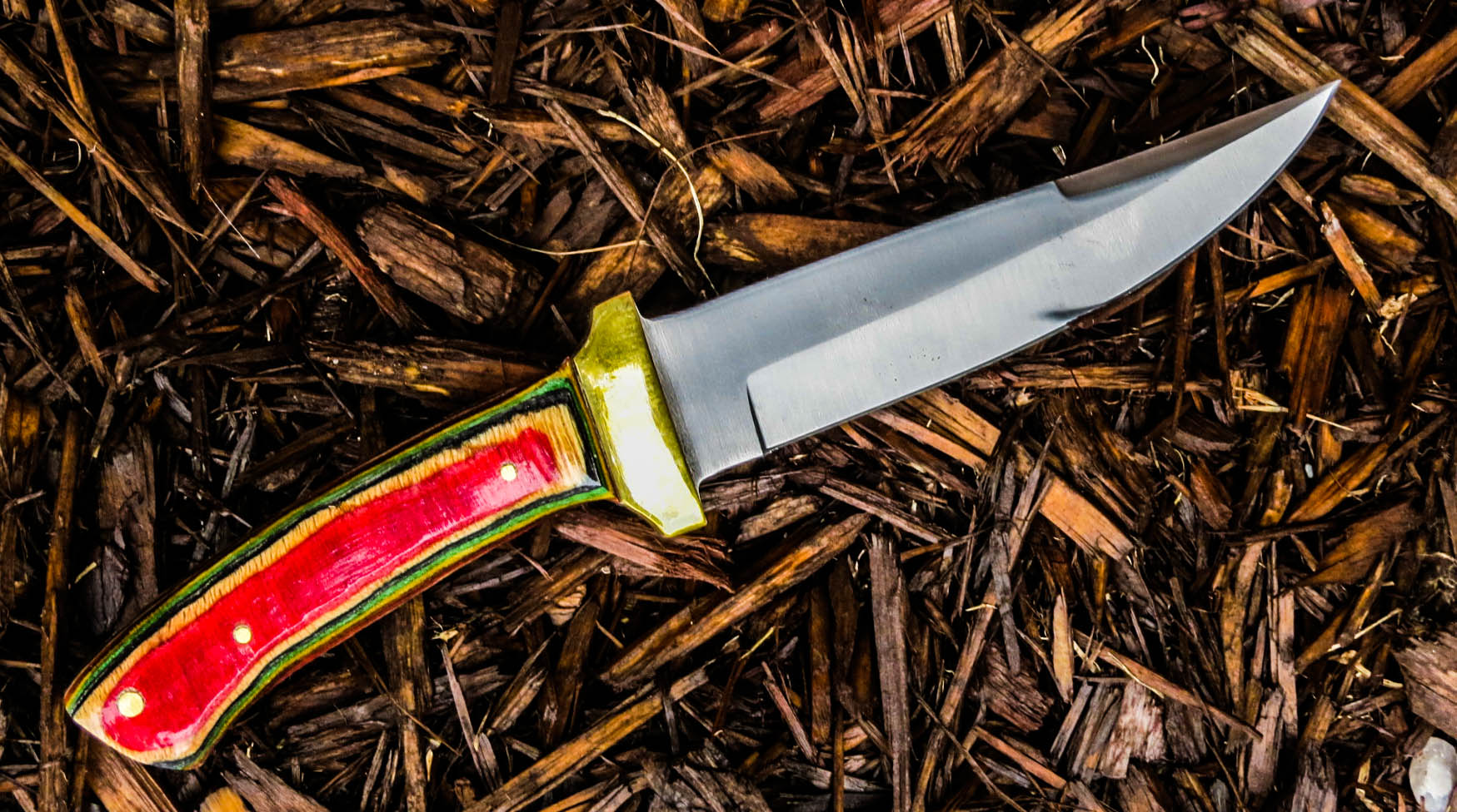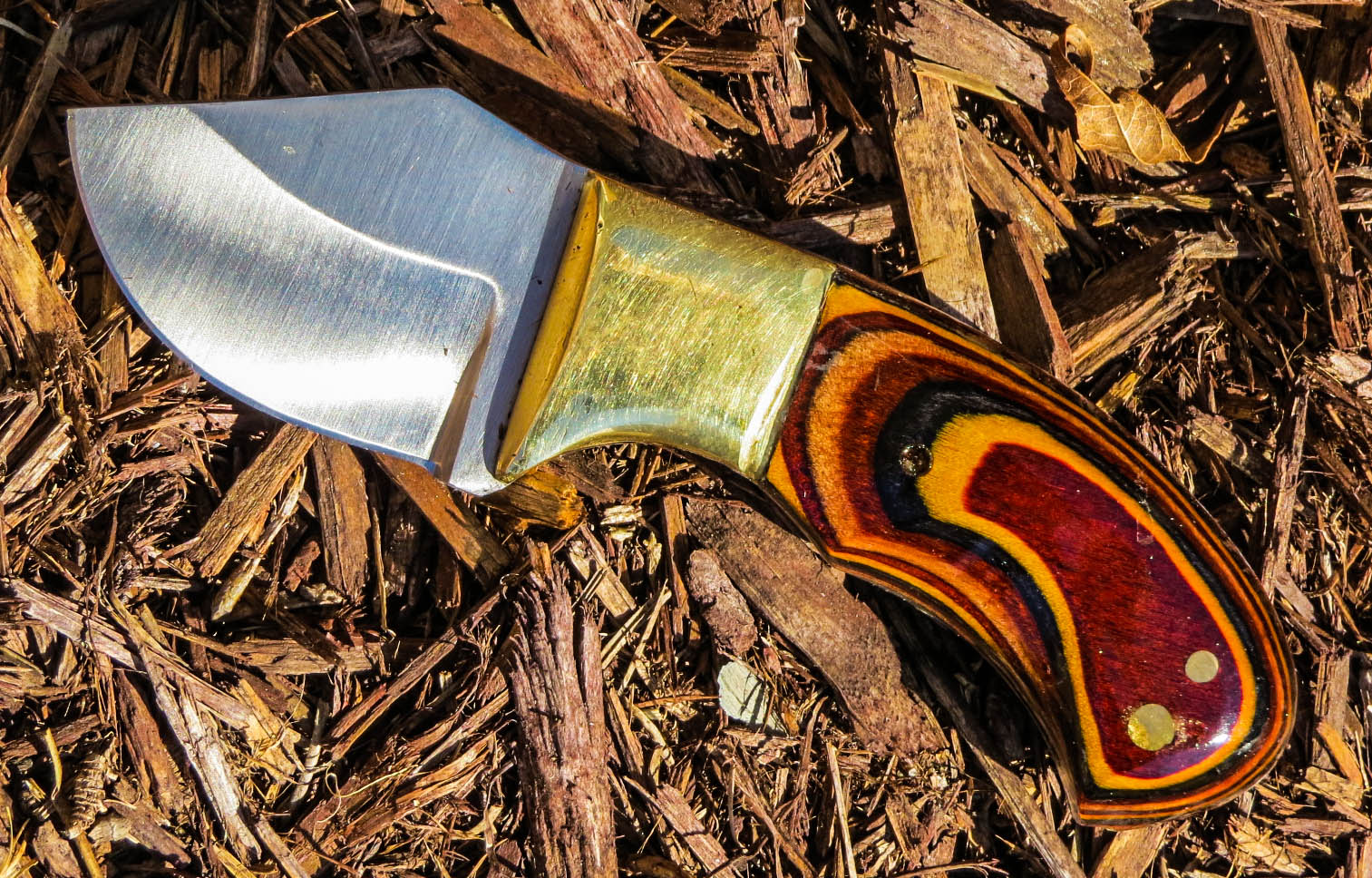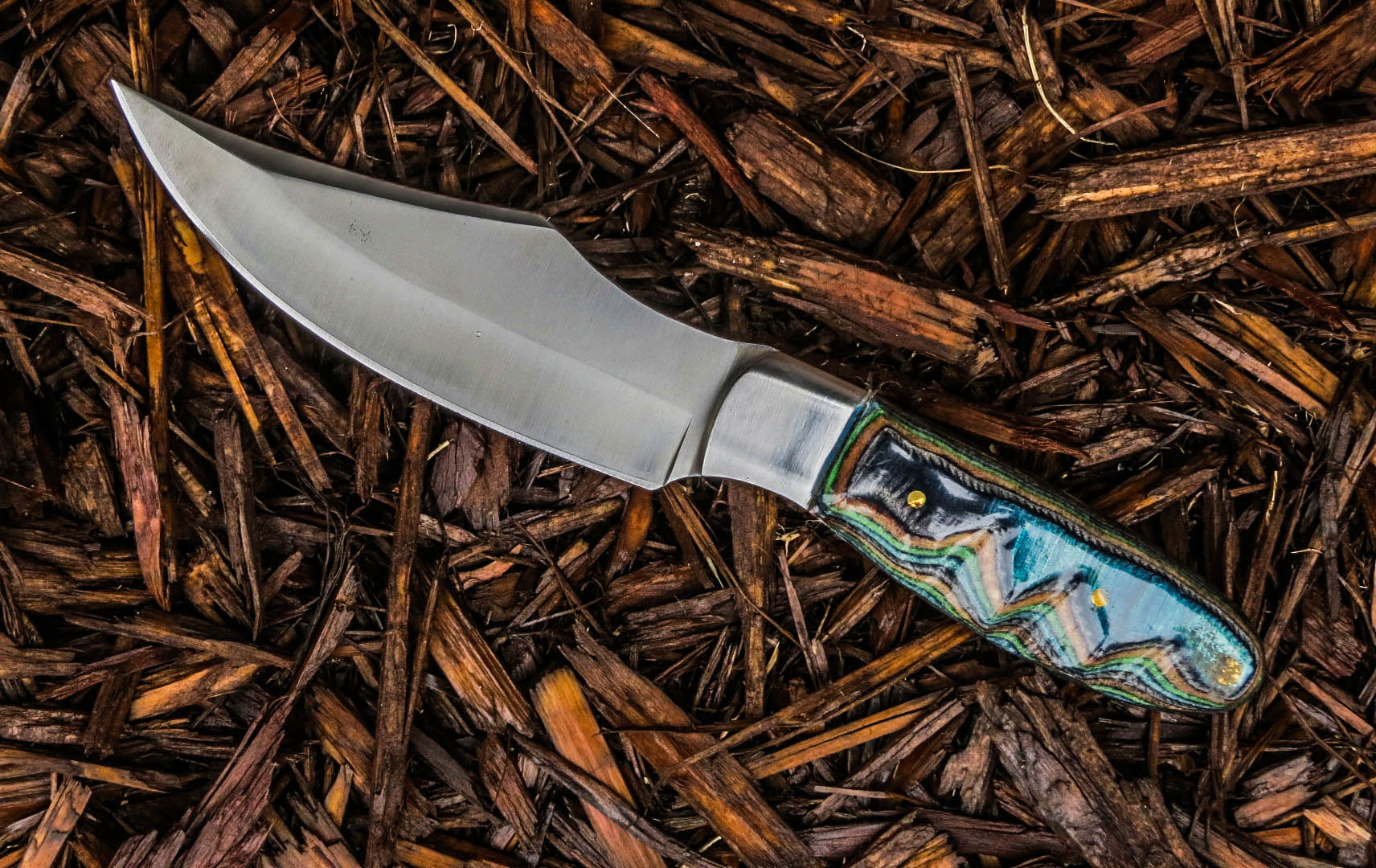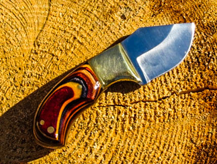 3. No longer available Full Tang Stubby Skinner Blade Knife. Stainless steel Short Skinner 2 1/8 inch blade. Full tang, brass guard, Dymondwood handle, total weight 7.4 ounces, total overall length 5 5/8 inches.
